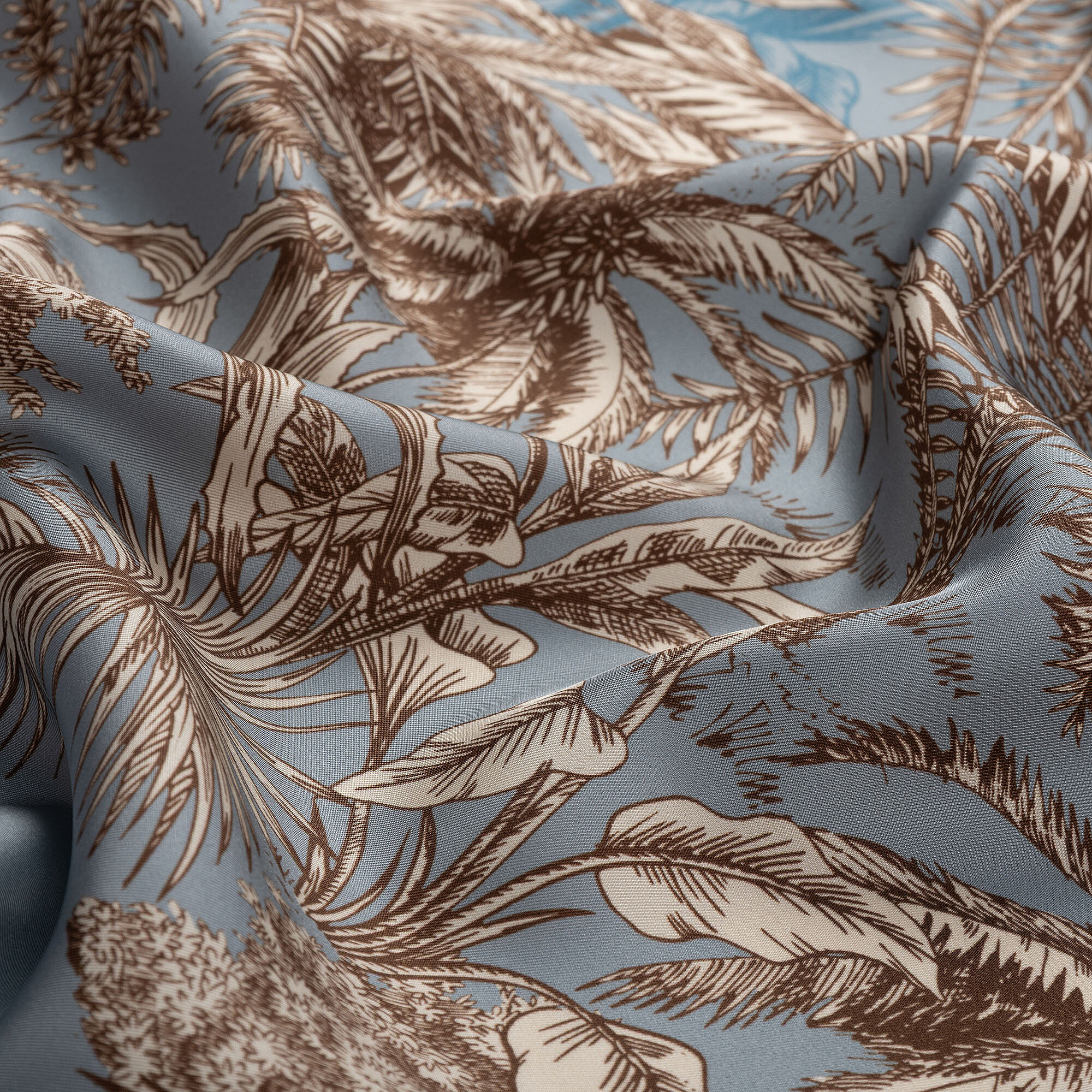 Buz mavisinin serin ve sakin tonu, egzotik vaha deseniyle %100 twill ipekte ferah ve büyülü bir aksesuar yaratıyor. Açık mavinin hafif ve aydınlık yapısı, vaha motiflerini hava gibi hafif ama etkili bir biçimde öne çıkarıyor. Vismara'nın açık mavi egzotik eşarbı, bahar kombinasyonlarına harika bir ferahlık katarken yaz gardıroplarının da gözdesi oluyor.