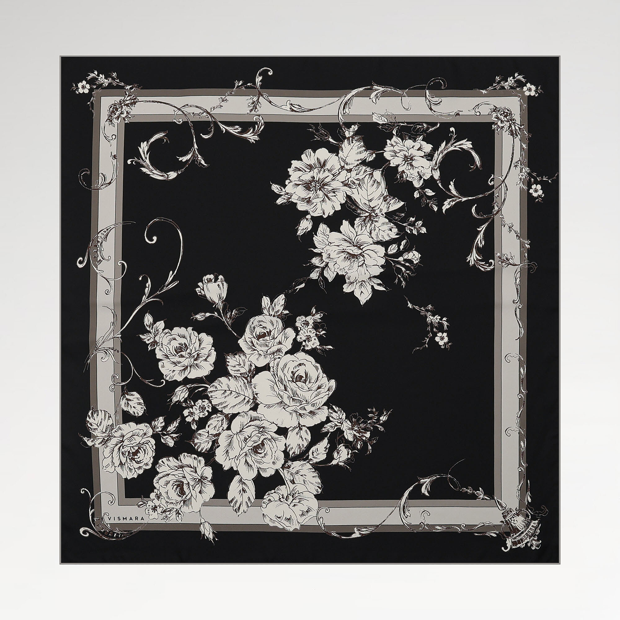 Baroque roses blooming on a black background create a dramatic and artistic look in 100% twill silk. Evoking a night garden, this magnificent pattern is one of the most striking pieces in the Vismara collection. The romantic and detailed structure of the baroque rose is added to the strong black background; the resulting accessory has a character that is both strong and elegant, both modern and historical.