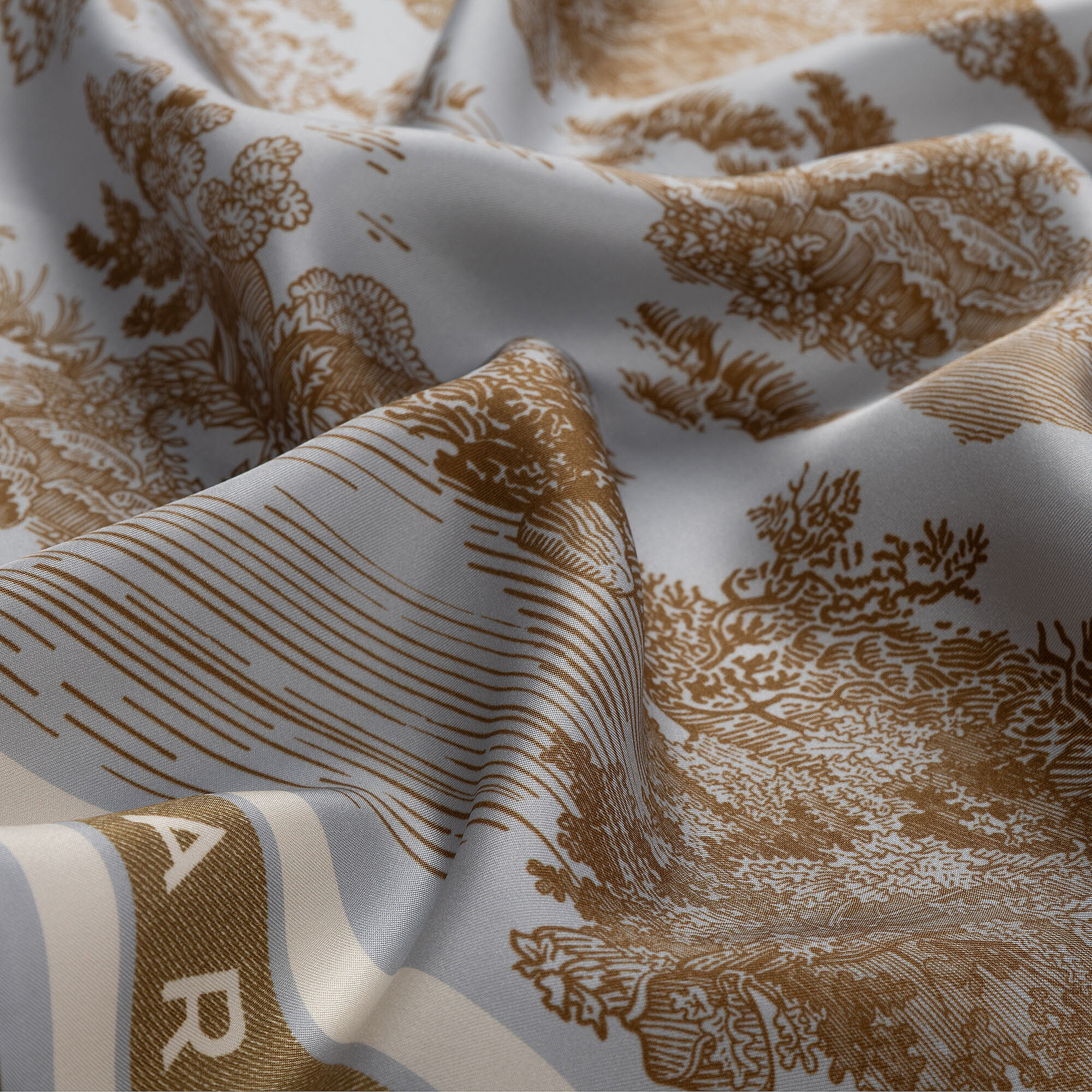 Inspired by French toile art, this garden-patterned twill silk Square Scarf offers a velvety touch to the skin with its 100% pure silk texture. The blue hue highlights the elegant garden motifs, adding a sophisticated touch to any outfit. This Square Scarf, meticulously crafted by Vismara, can be used as a necktie, hair accessory, or bag charm. With its 90x90 cm twill silk quality, it makes a difference in every setting, from everyday elegance to special occasions.