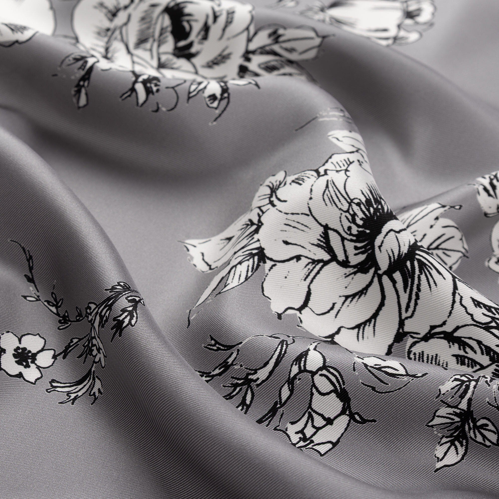 The cool stance of modern grey, combined with a baroque rose pattern in 100% twill silk, creates a sophisticated accessory that blends history with contemporaneity. The neutral tone of grey is balanced by the romantic forms of the rose, creating an elegant yet powerful whole. This Vismara quality Square Scarf is a perfect piece to complement city-chic combinations, especially those based on grey tones. The star of the modern classics collection.