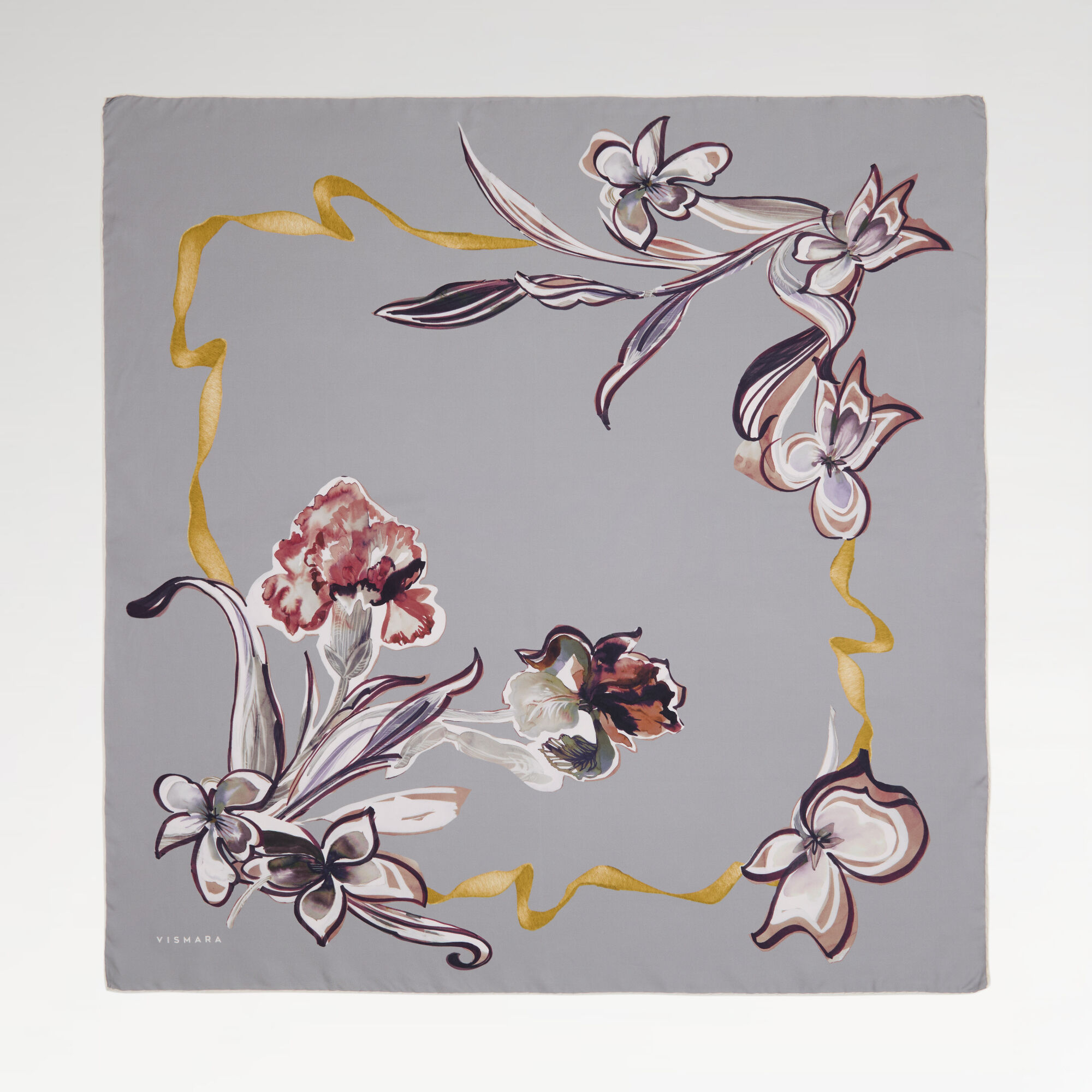 Grey Carnation and Lily Flower Patterned Twill Silk Square Scarf