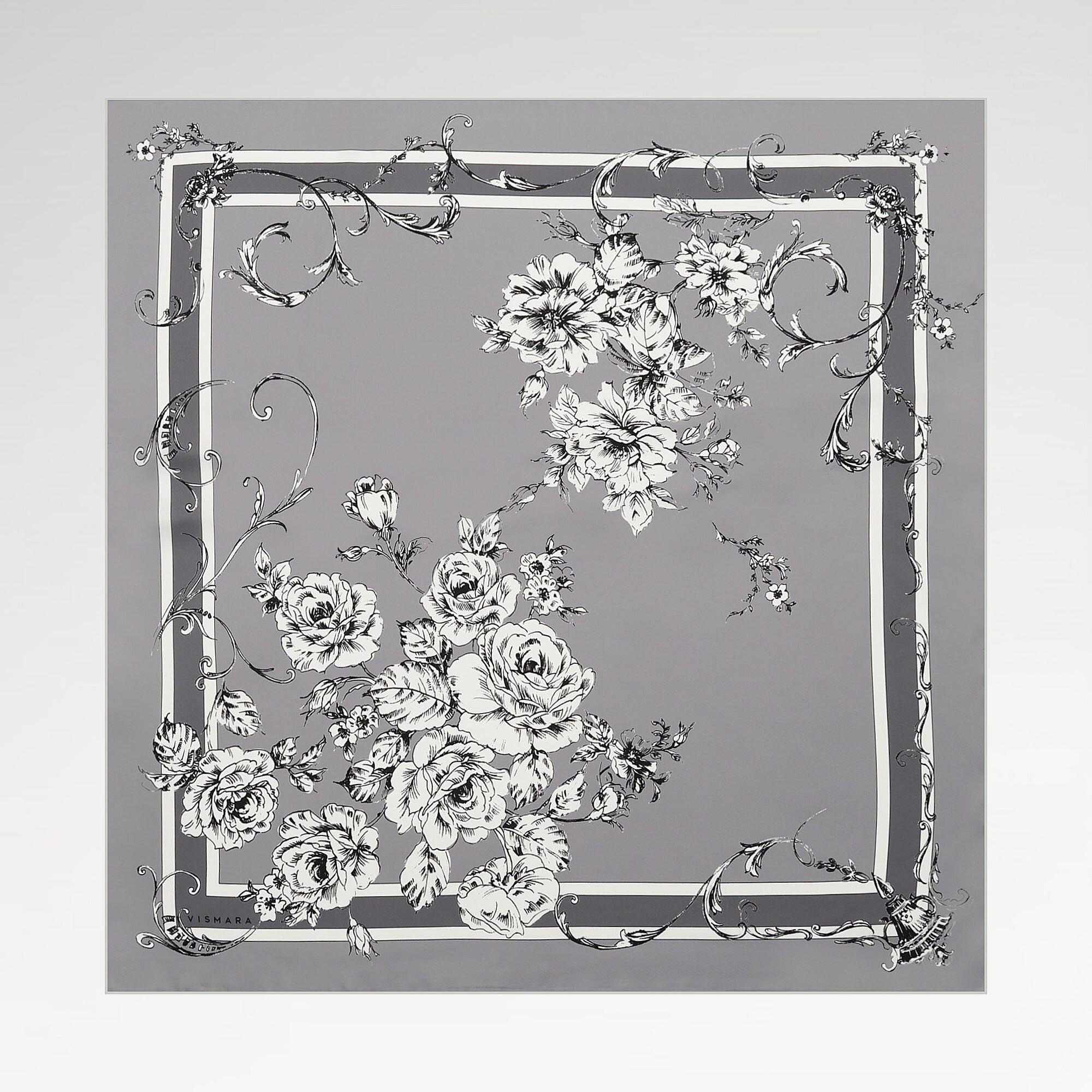 Modern grinin soğuk duruşu, barok gül deseniyle %100 twill ipekte tarih ile çağdaşlığı buluşturan sofistike bir aksesuar yaratıyor. Grinin nötr tonu, gülün romantik formlarıyla dengelenerek zarif ama güçlü bir bütünlük oluşturuyor. Vismara kalitesindeki bu eşarp, özellikle gri ton üzerine kurulan city-chic kombinasyonları tamamlayan mükemmel bir parça. Modern klasikler koleksiyonunun başrolü.