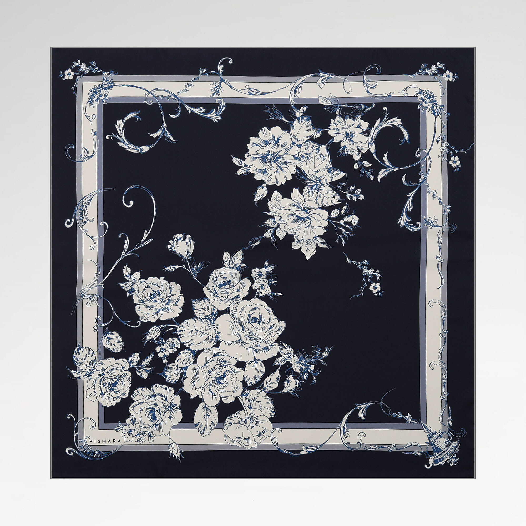 Güvenilir ve zarif lacivert zemin üzerinde açan barok güller, %100 twill ipekte klasiğin içinde bir romantizm yaratıyor. Lacivertin geleneksel yapısı barok desenin süslü formlarıyla renklenerek günümüze özgün bir yorum kazanıyor. Vismara'nın lacivert barok gül eşarbı, iş hayatındaki şıklığı romantik bir dokunuşla yumuşatmak isteyenler için biçilmiş kaftan bir aksesuar.