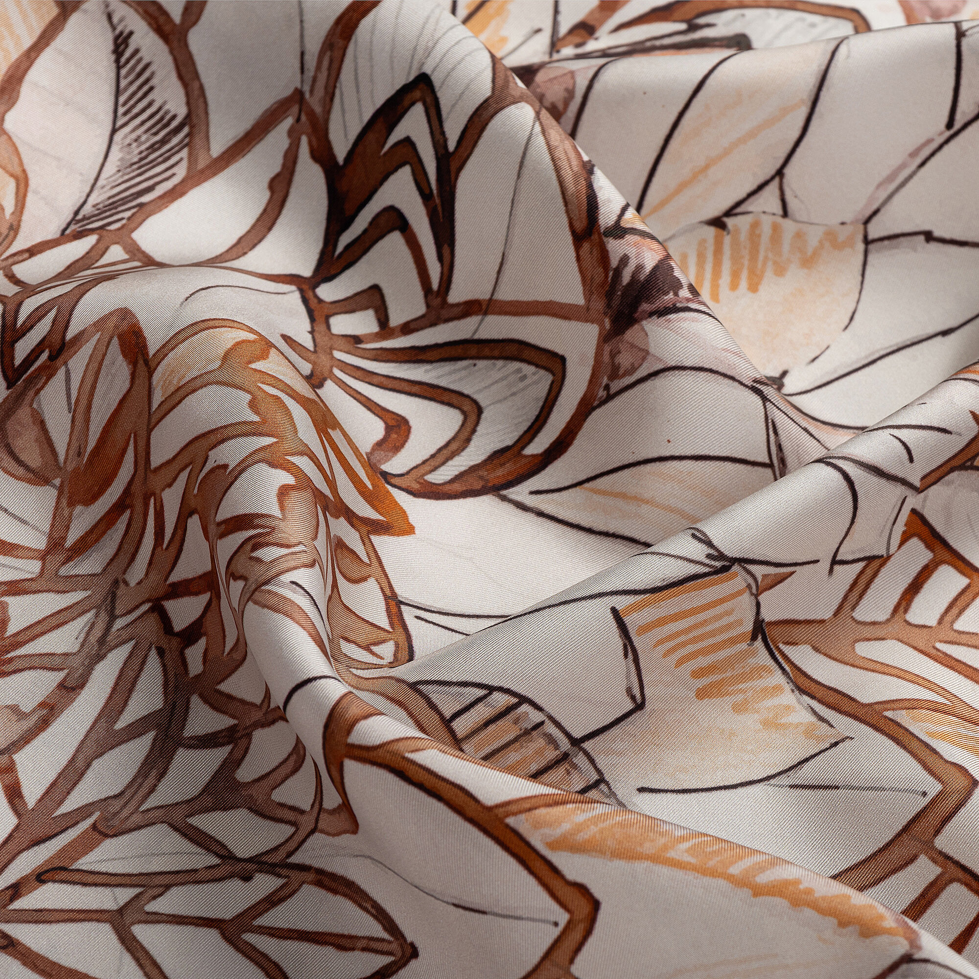 The warm and delicate mink tone, with its floral leaf pattern, creates a serene luxury in 100% twill silk. Resembling beige but with a deeper and more sophisticated feel, mink offers a neutral accessory that complements any wardrobe. This special silk Square Scarf from Vismara achieves perfect tonal harmony with camel, brown, and cream tones, while also adding an elegant softness to black outfits.
