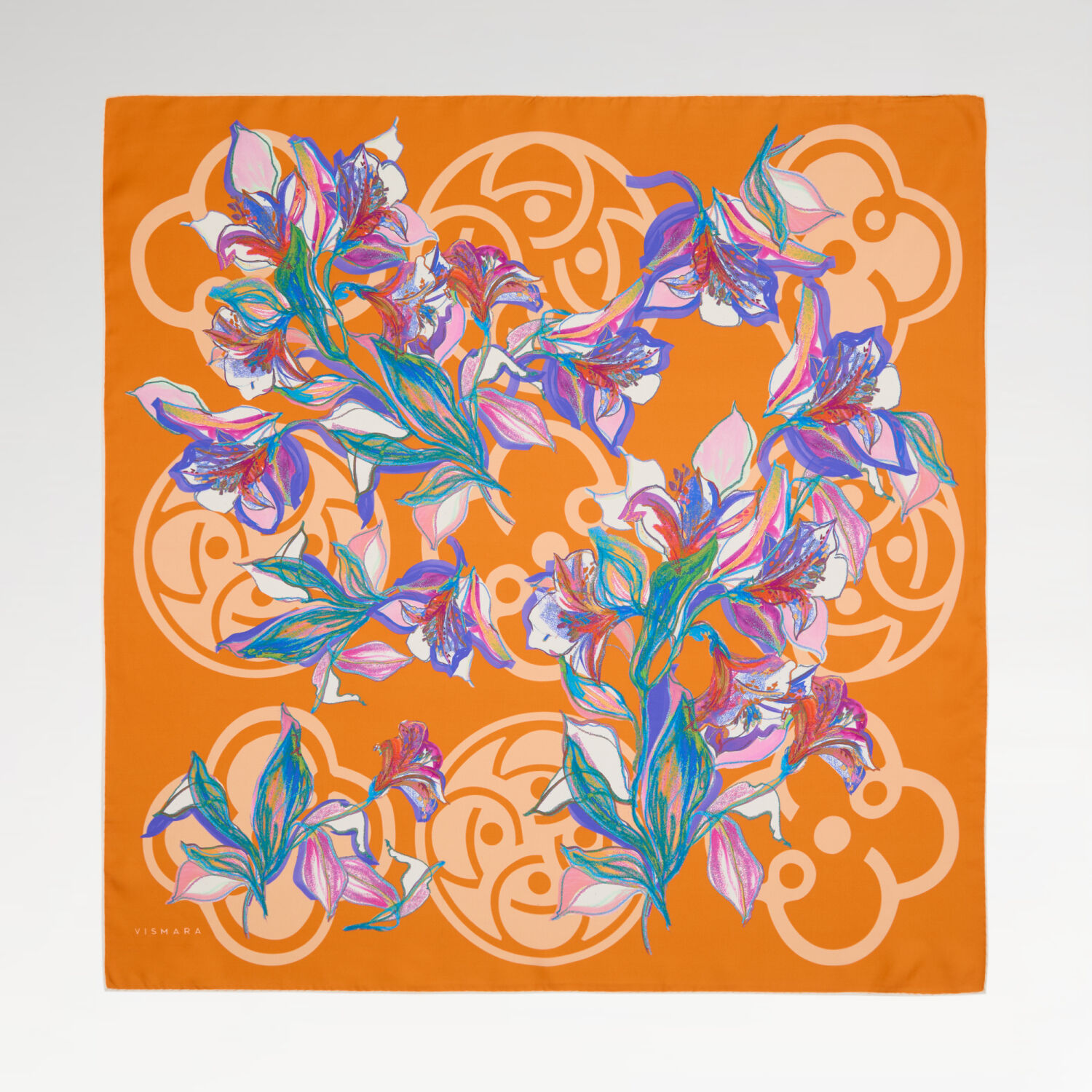 Orange Vismara Monogram Lily Flower Pattern Twill Silk Square Scarf