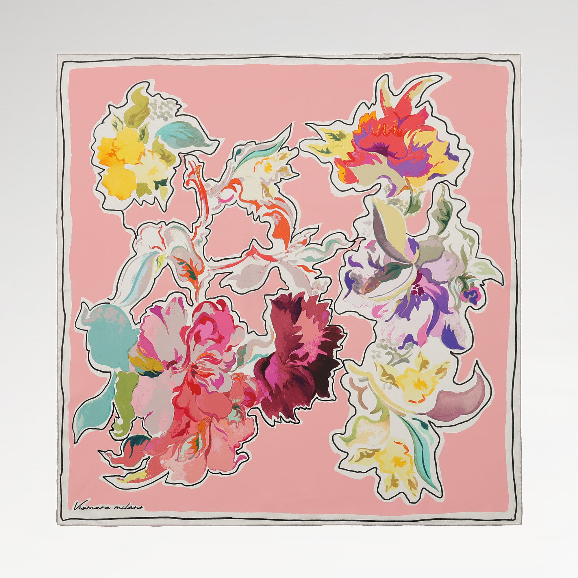 Dancing abstract flora motifs on a delicate powder pink background create a romantic and modern balance in 100% twill silk. The fusion of artistic aesthetics with feminine tones creates a unique beauty specific to Vismara's abstract flora collection. The soft effect of powder pink transforms the abstract pattern from a harsh one into a soft and inviting look. The first choice for lovers of pastel-modern style.