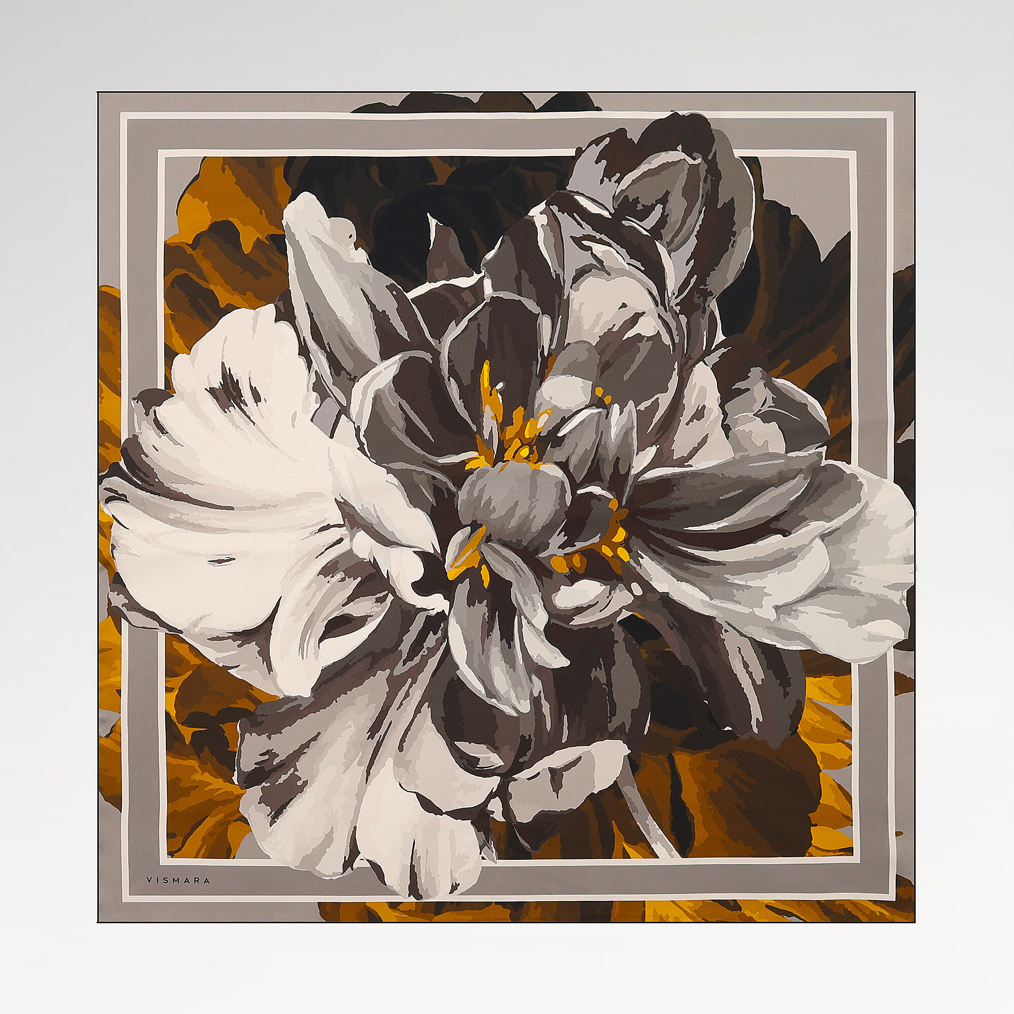 Işıltılı sarı zemin üzerinde açan şakayık çiçekleri, %100 twill ipekte güneşi andıran neşeli ve enerjik bir aksesuar yaratıyor. Parlak sarı zemin şakayık motiflerinin her ayrıntısını vurgulayarak göz alıcı bir desen bütünlüğü sağlar. Vismara'nın bu renkli ve çarpıcı ipek eşarbı, sade siyah veya beyaz kombinasyonlara anında hayat verir; yaz kokteyllerinde ve özel buluşmalarda dikkat çeken bir aksesuar olur.