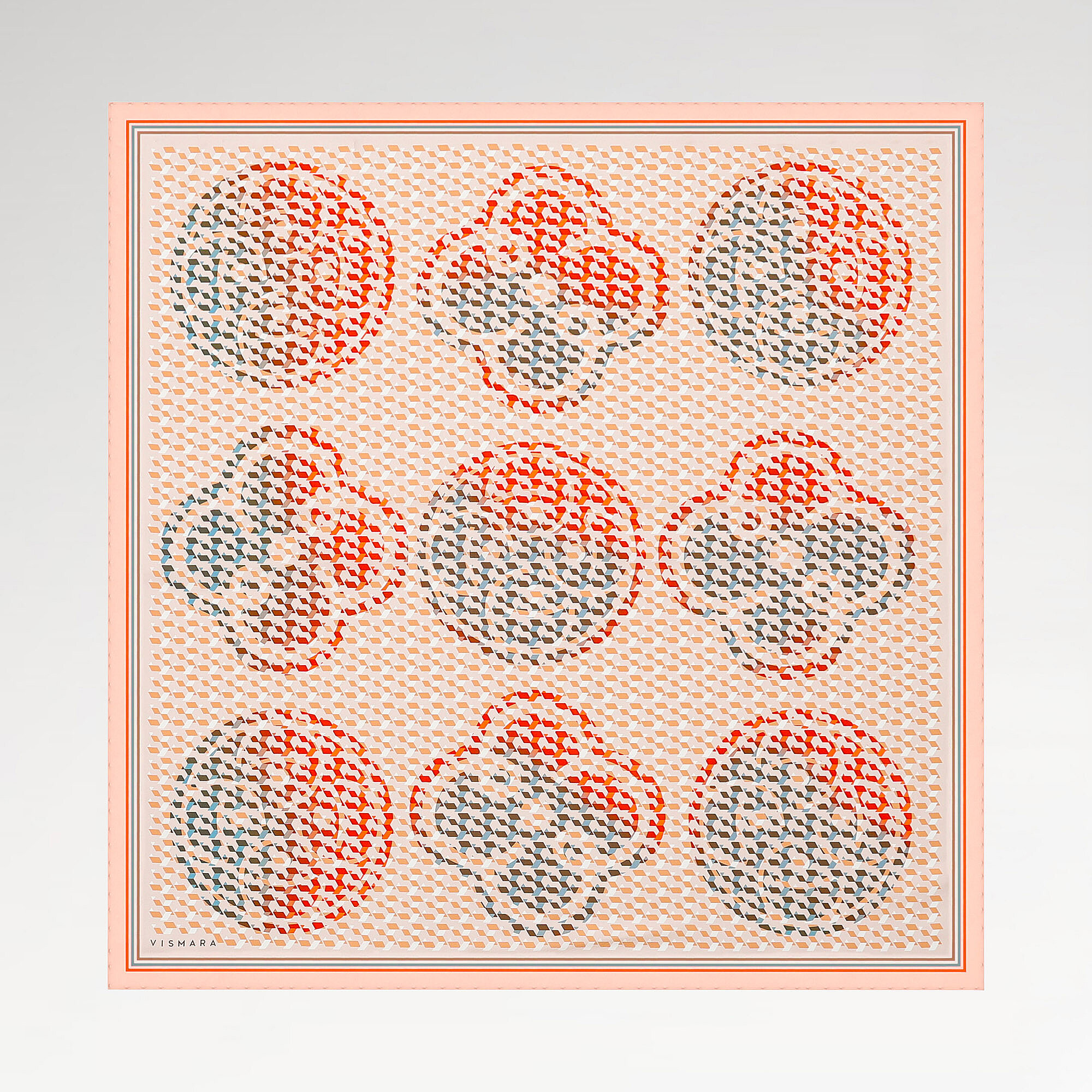 Caldo e invitante colore salmone, con il suo motivo monogramma isometrico, crea un accessorio elegante e moderno in 100% seta twill. Con il suo tono femminile e la struttura geometrica, questa sciarpa quadrata aggiunge morbidezza e struttura agli outfit femminili. Nella collezione isometrica di Vismara, il tono salmone trova il perfetto equilibrio tra rosa e arancione, raggiungendo un'eleganza universale.