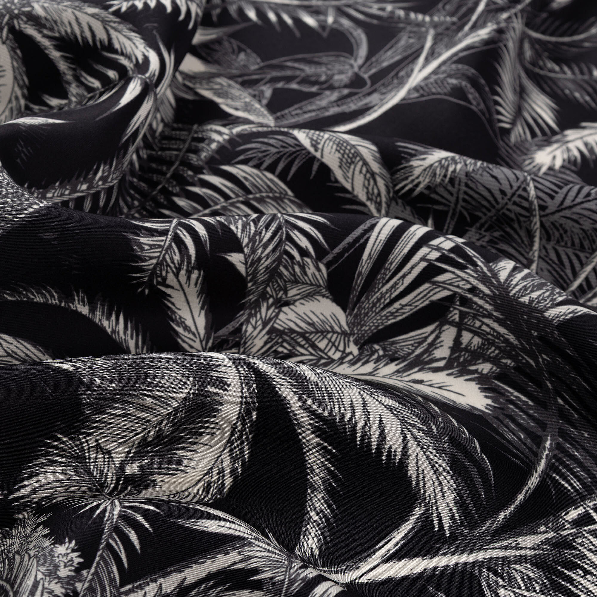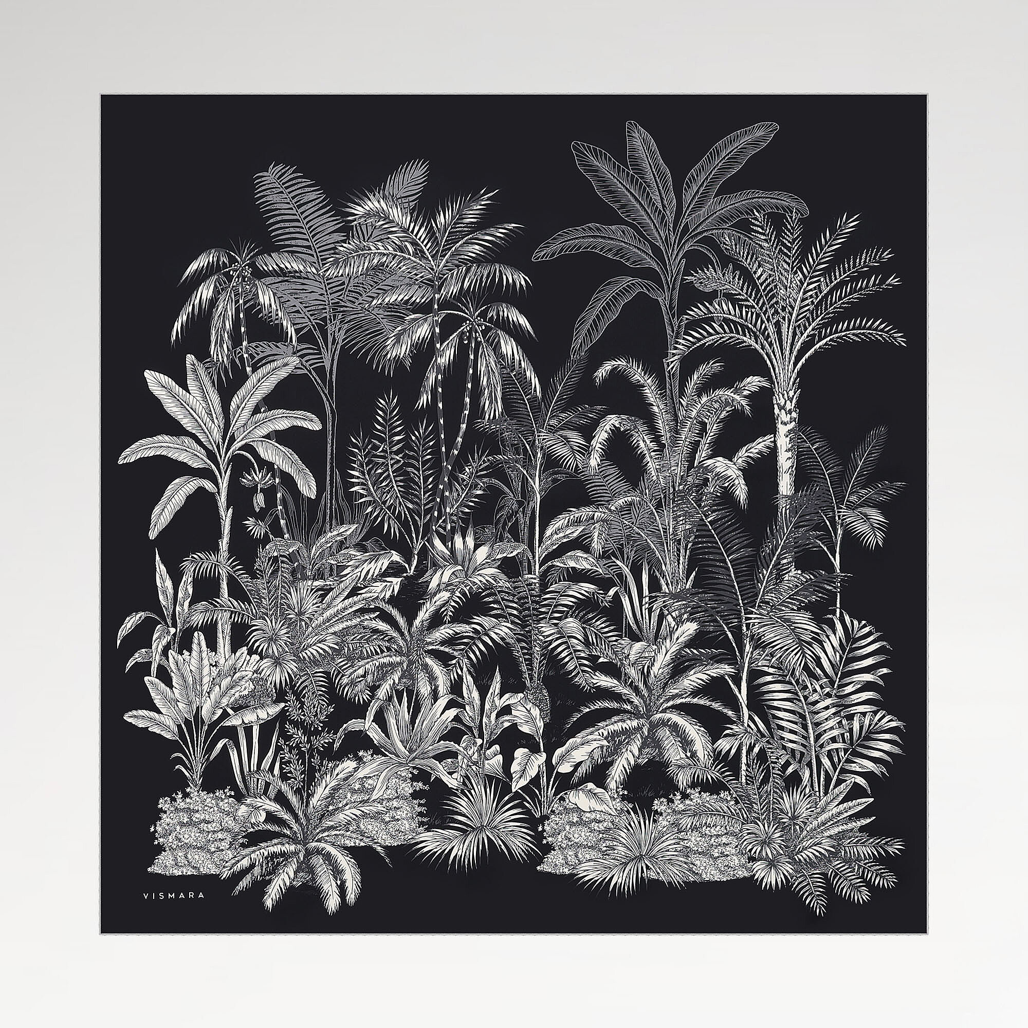 Motivi esotici da oasi creano un quadro drammatico e suggestivo che ricorda un'oasi notturna su uno sfondo nero di seta twill 100%. Il forte sfondo nero mette in risalto i motivi tropicali e intricati del disegno con cristallina chiarezza, creando il pezzo più sorprendente della collezione. La sciarpa quadrata esotica nera di Vismara è un accessorio di lusso che fa la differenza in ogni contesto, dalle occasioni speciali alle fughe in città.