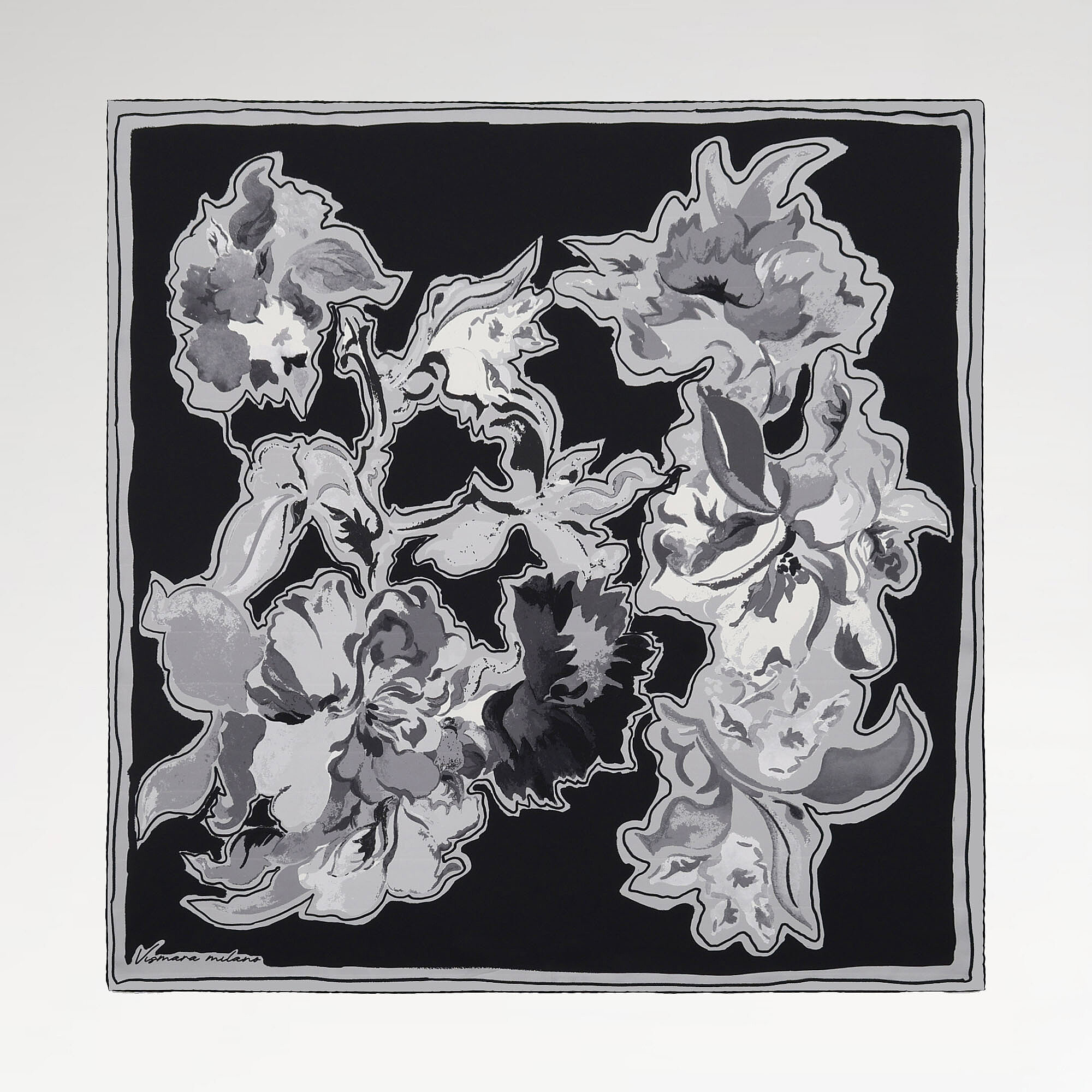 Motivi floreali astratti e artistici creano un dipinto degno di un museo su uno sfondo nero realizzato in 100% seta twill. La sorprendente combinazione di forme geometriche e organiche trasforma la collezione floreale astratta di Vismara in arte della moda. Forme floreali astratte che brillano su uno sfondo nero; una sciarpa quadrata pensata per donne moderne, audaci e artistiche. L'accessorio più potente per i guardaroba minimalisti.