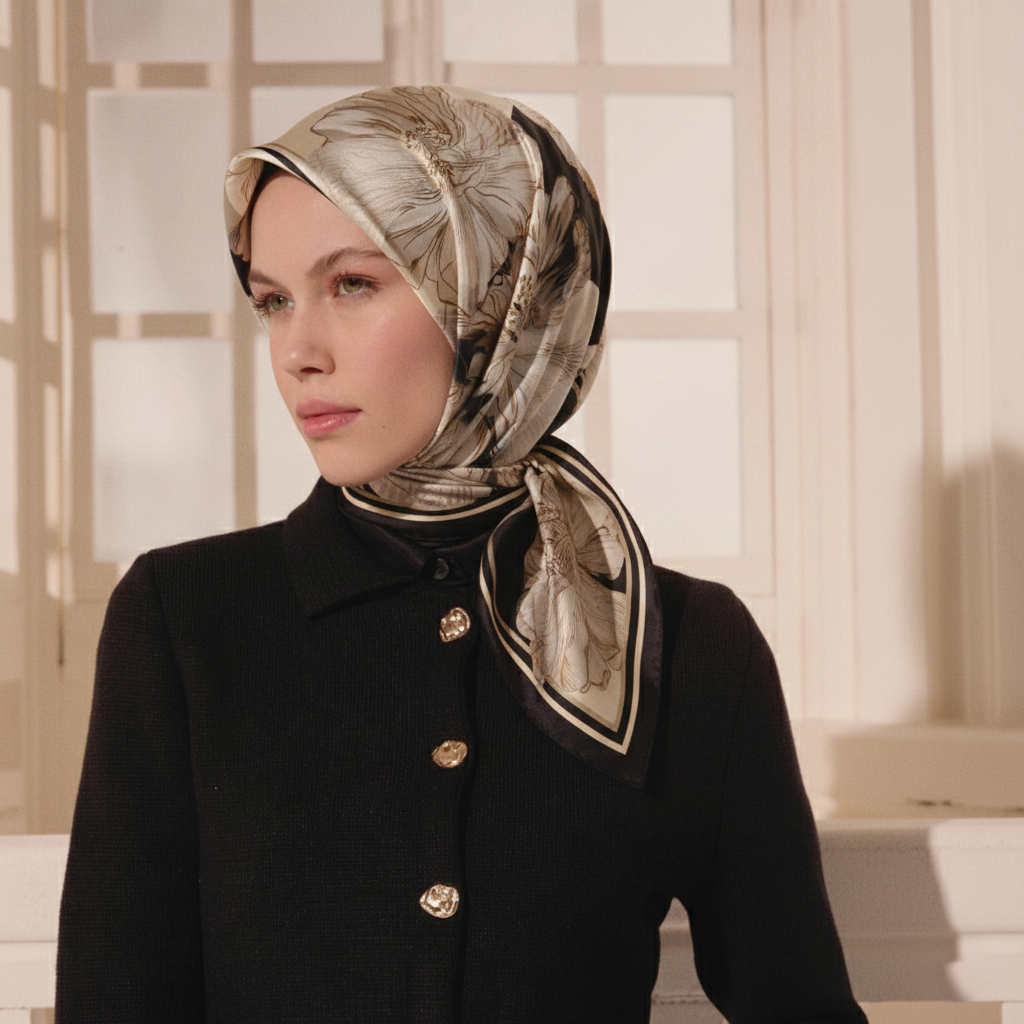 Sciarpa quadrata in twill di seta con motivo Linea Fiora nero