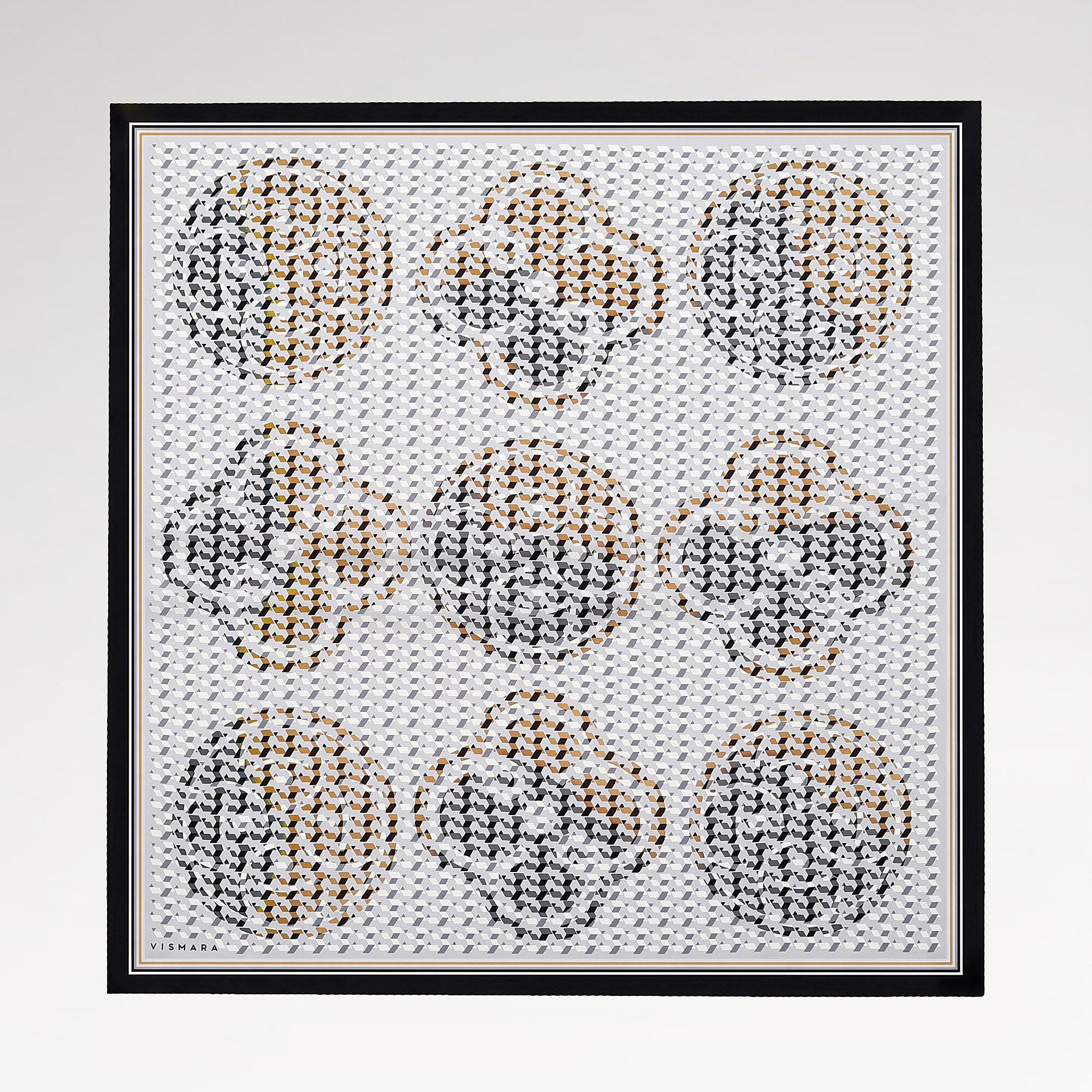 L'eleganza sobria del grigio moderno e urbano, con il suo motivo a monogramma isometrico, offre un tocco minimalista in 100% seta twill. Comprendendo tonalità chiare e medie, questa sciarpa quadrata grigia si abbina perfettamente ai toni sofisticati del mondo del lavoro, supportando un'immagine professionale. L'approccio geometrico di Vismara esalta ogni sfumatura di grigio con la sua bellezza unica. Un must-have per uno stile office-chic.