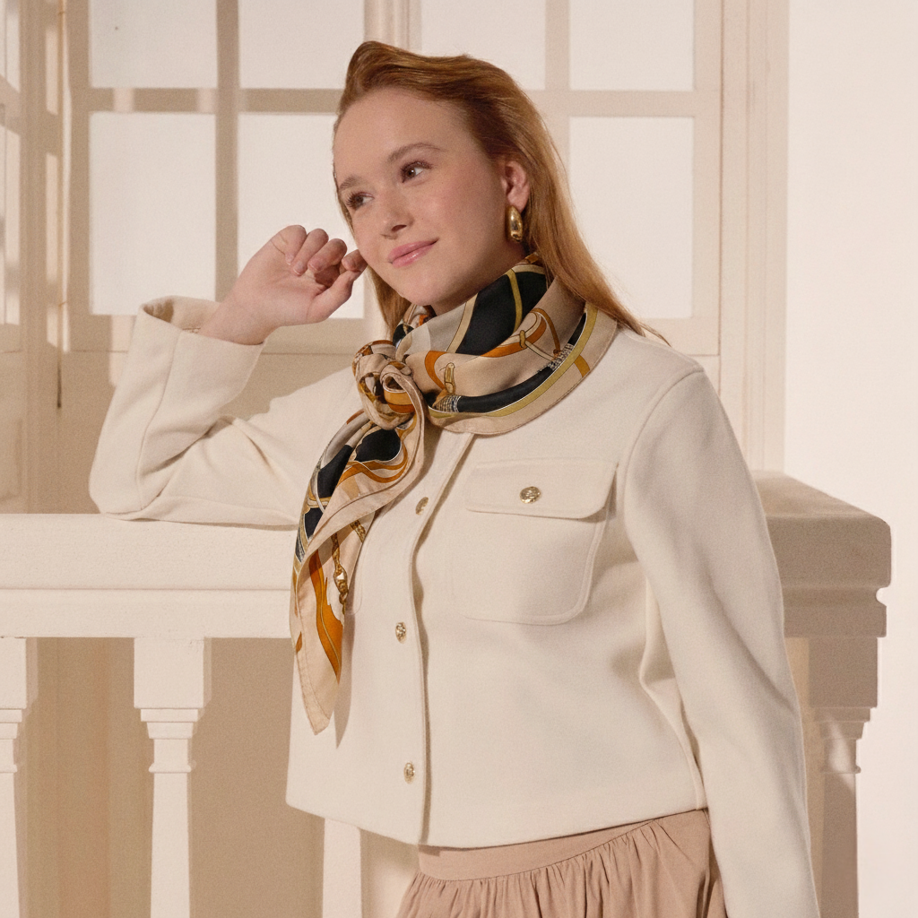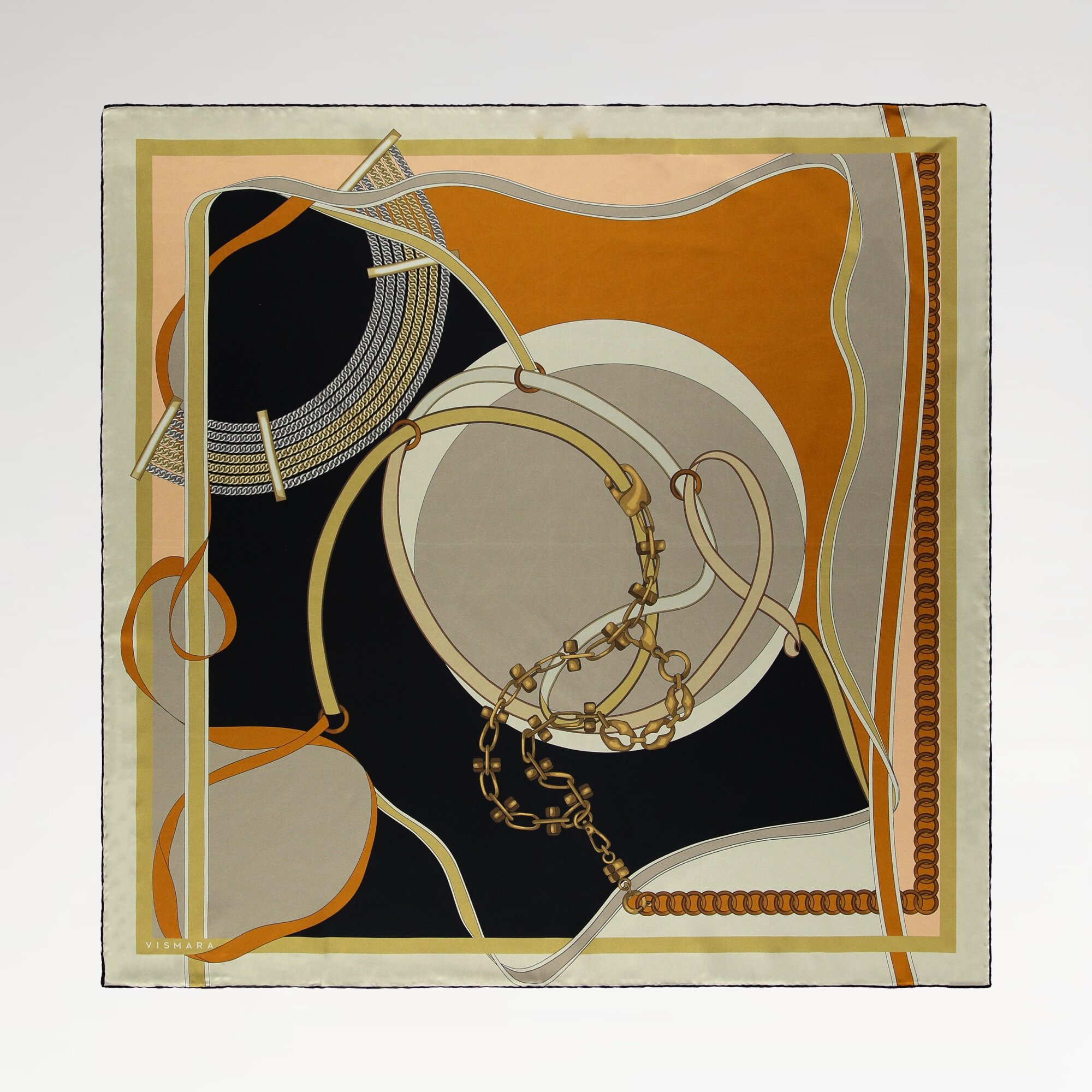 Siyah Bej Zincir Armonisi Desenli Twill İpek Eşarp