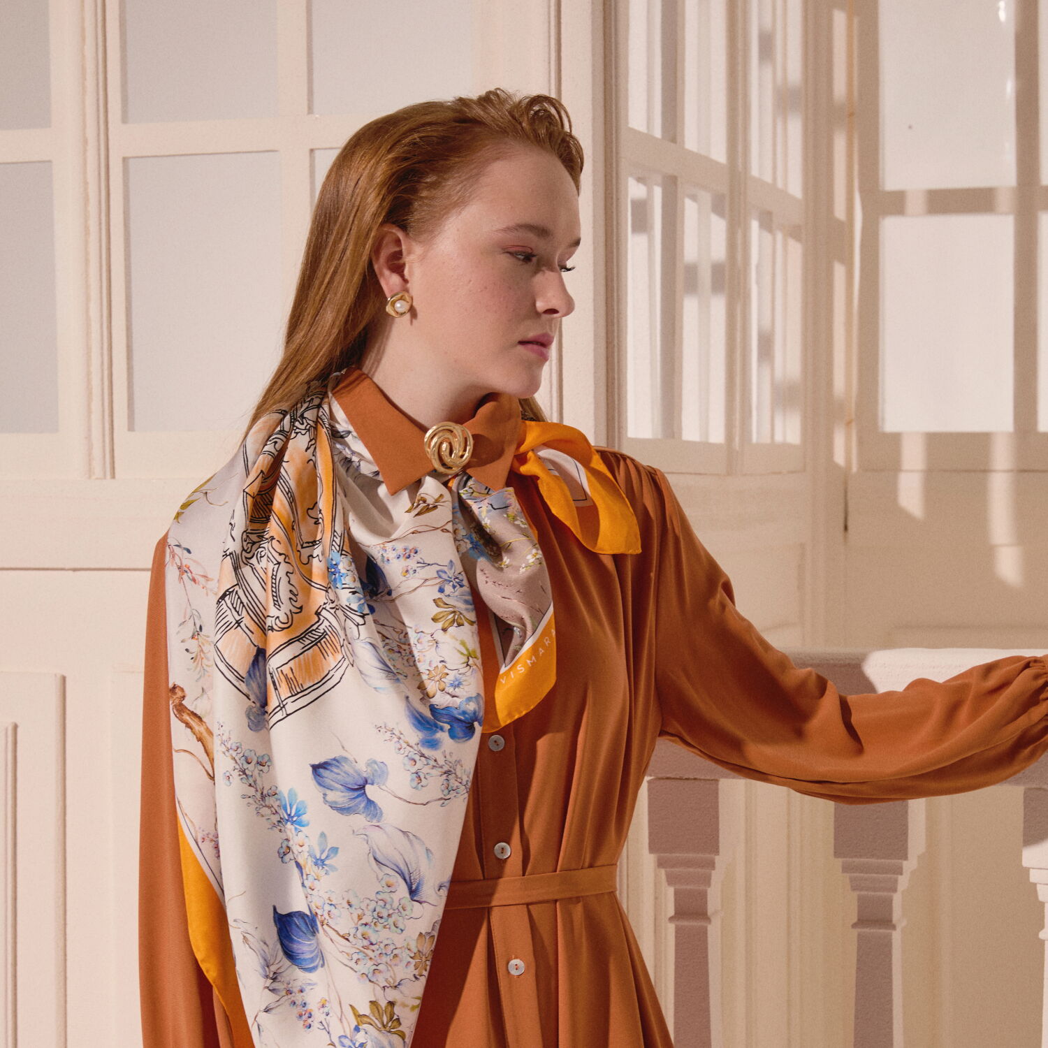Turuncu Vintage Çiçekli Kapı Desenli Twill İpek Eşarp
